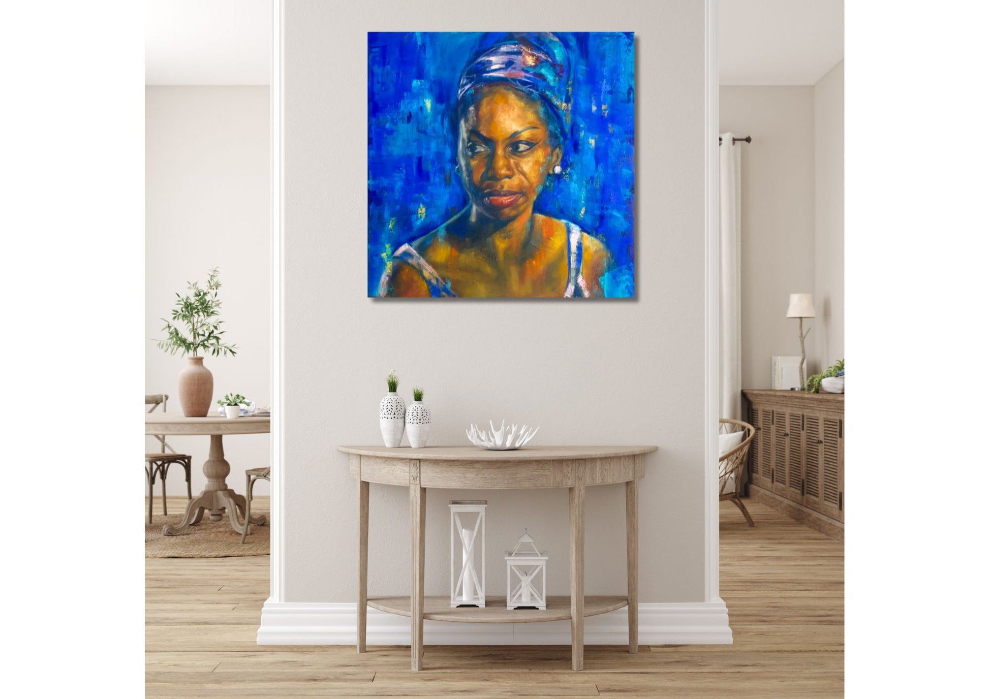 A powerful and soulful portrait celebrating the legendary Nina Simone. Painted in rich oil tones, this expressive piece captures her depth, strength, and vulnerability — a true icon of music and resilience. The bold blues and warm ochres merge in textured layers, creating a sense of rhythm and emotion that echoes her timeless voice.
