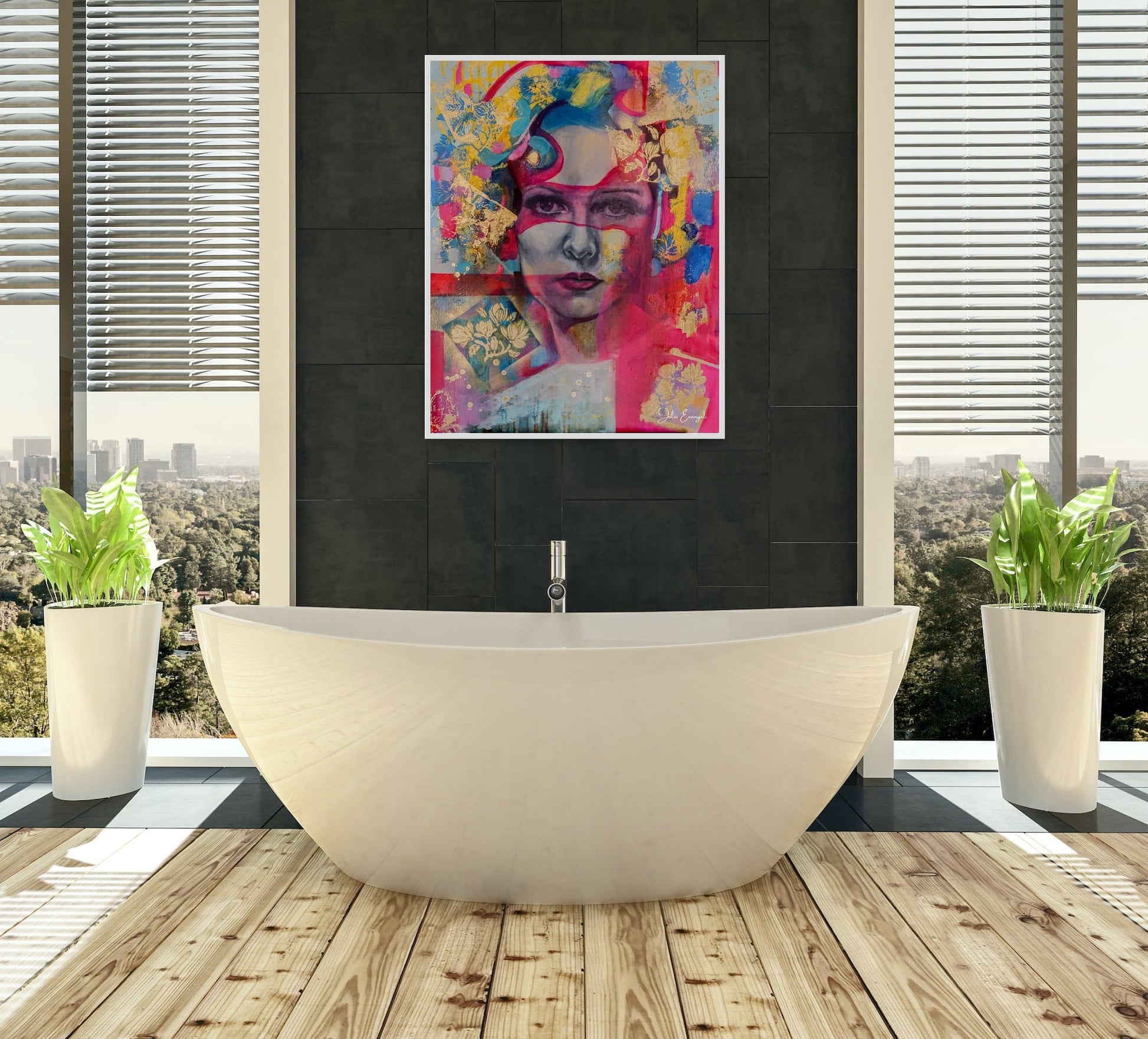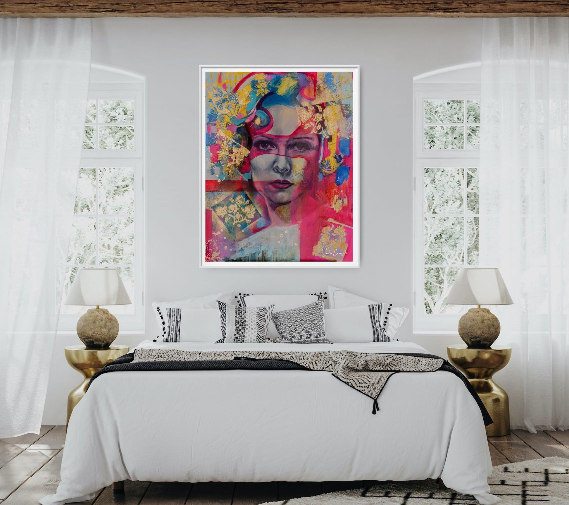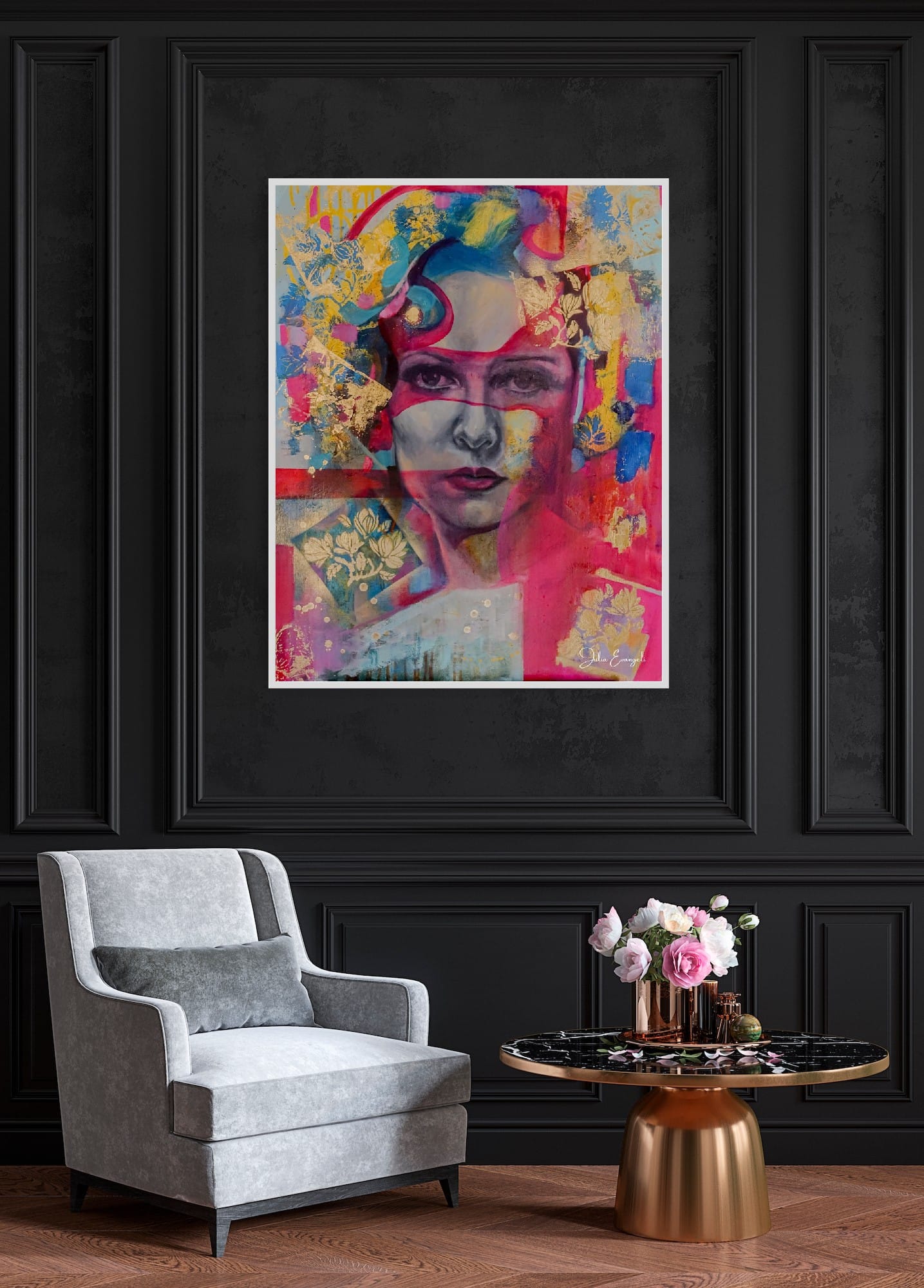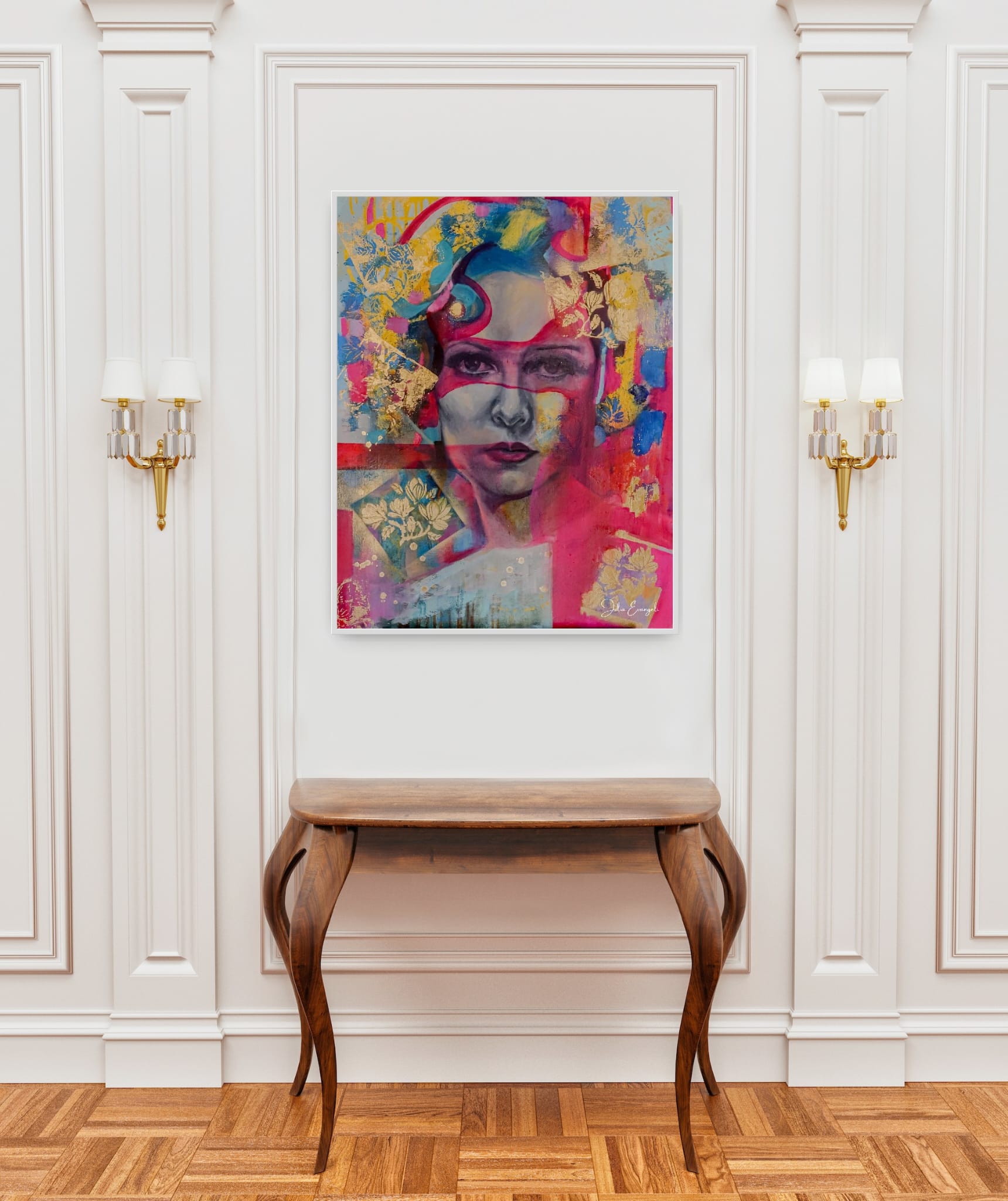 Vibrant pinks, electric blues, and shimmering gold leaf ripple around her like sacred ribbons of emotion. Layers of paint, pattern, and abstraction weave together into an atmosphere that feels both fierce and feminine — a celebration of strength, softness, and inner fire.