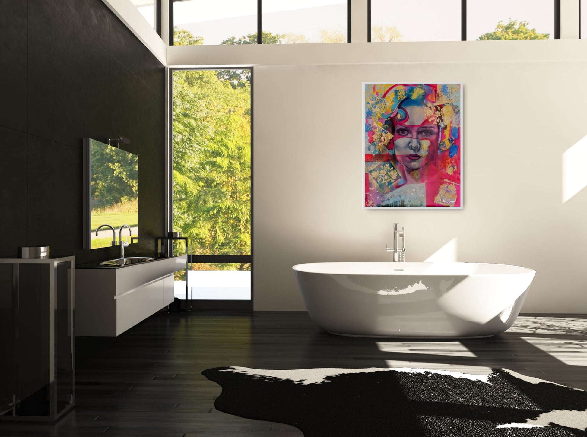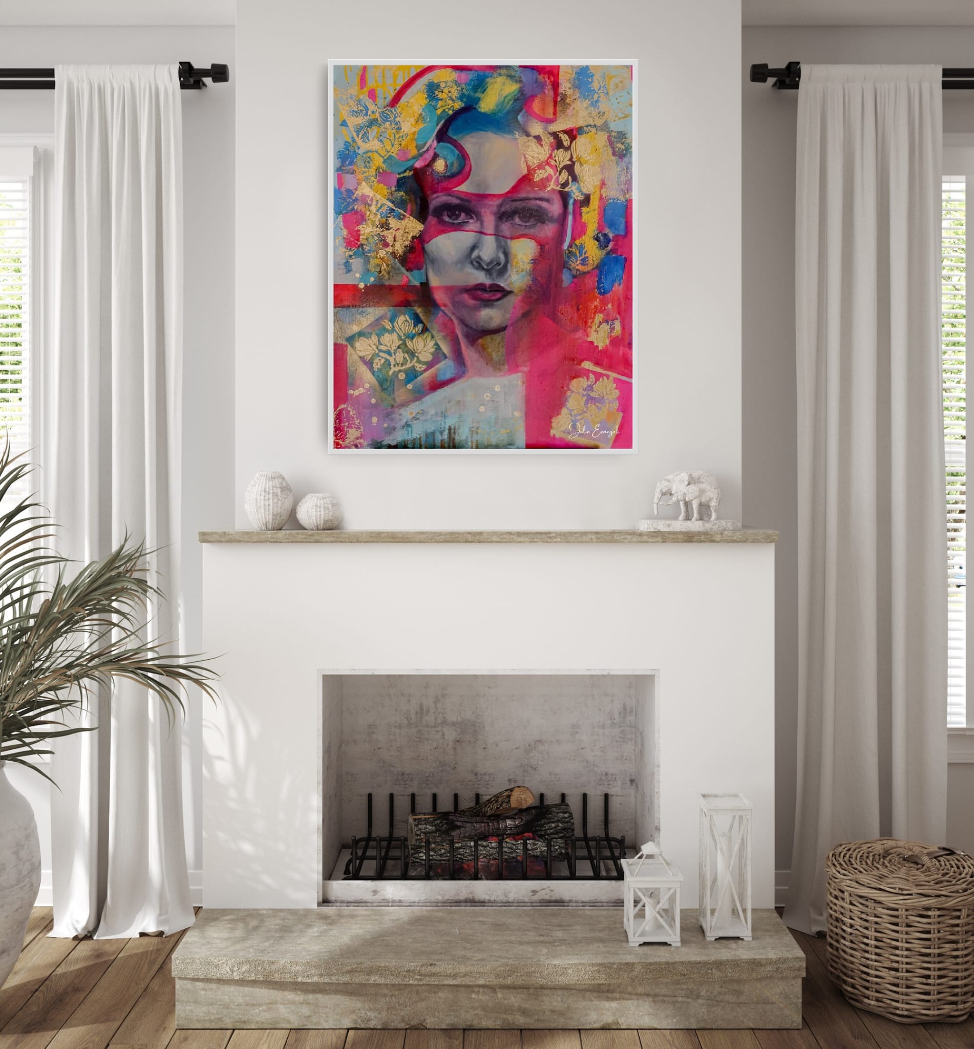 This piece radiates depth and movement. Stand close and you’ll see the delicate shifts of colour in the portrait; step back and the entire canvas becomes a dynamic symphony of energy, symbolism, and intuition. It’s bold, expressive, unapologetic — a true statement piece for any space that wants to feel alive.