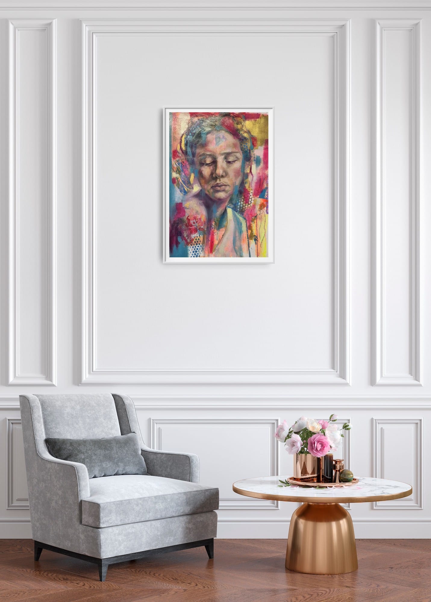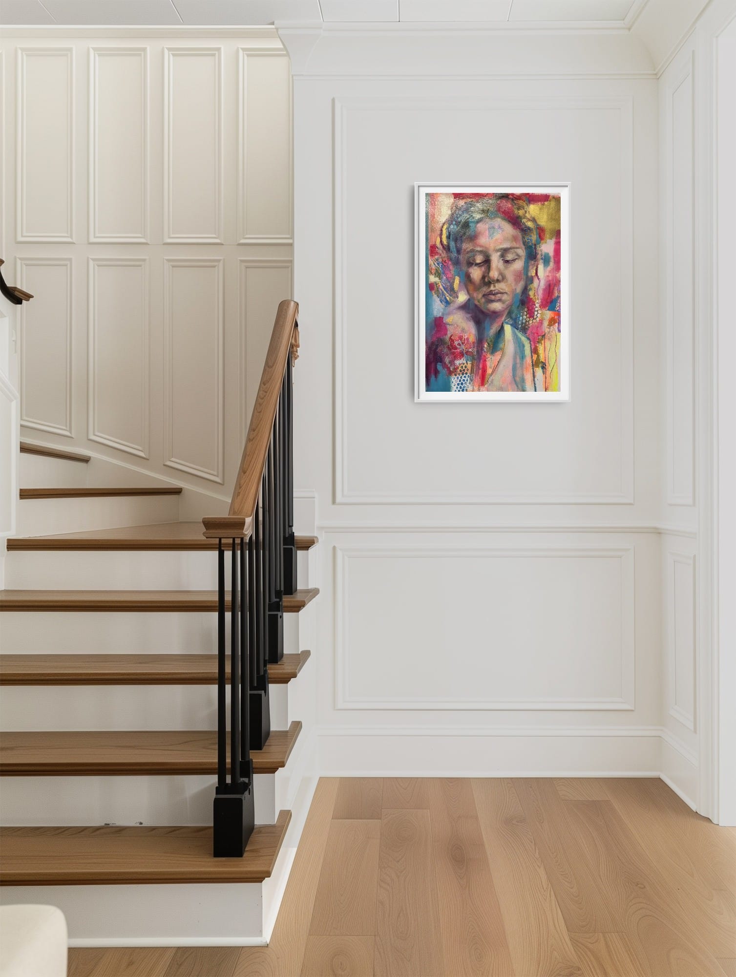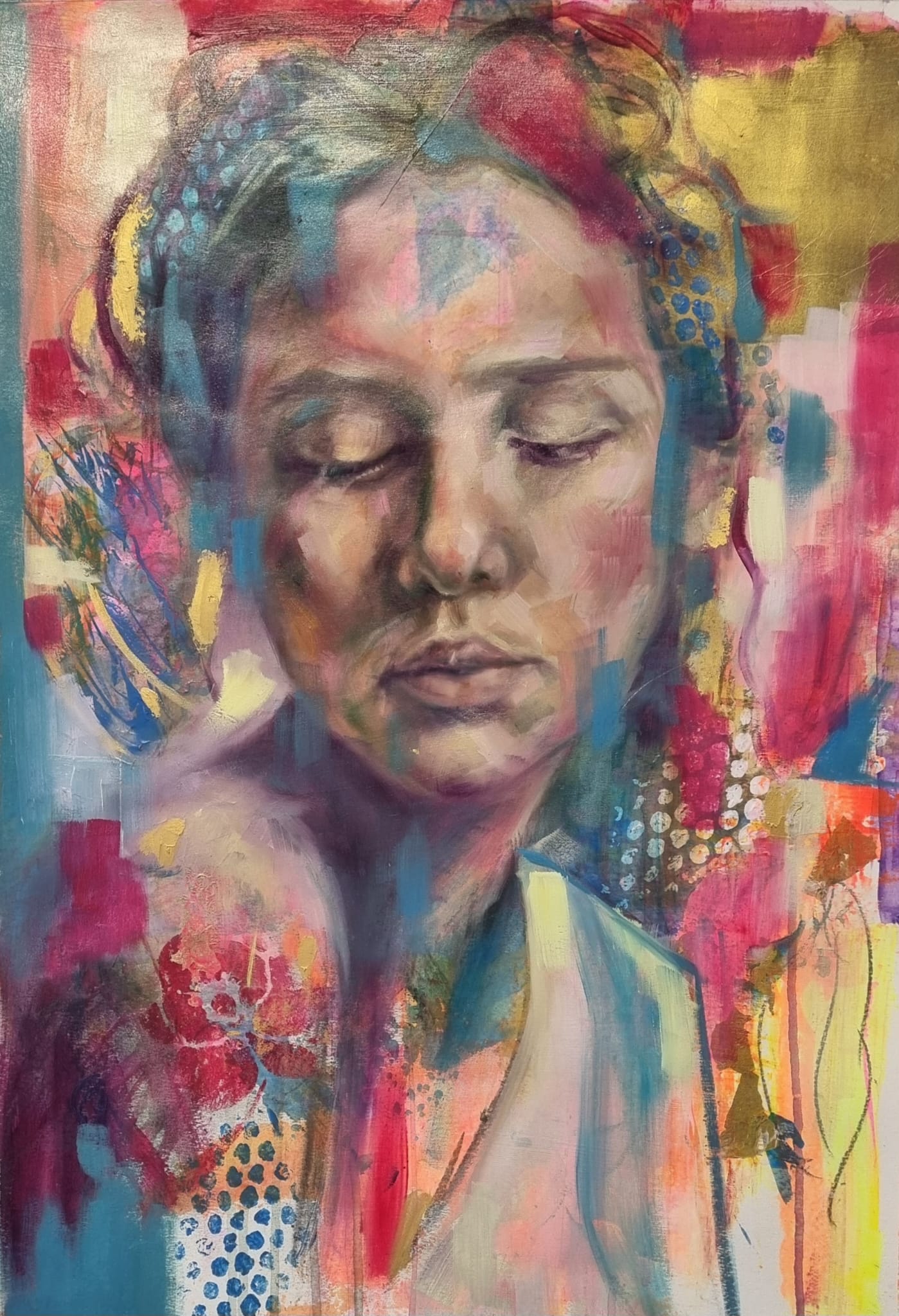 A deeply introspective portrait that captures the tender strength of stillness. Painted in expressive layers of soft blush, gold, and electric blue, this piece combines realism with abstract mark-making to evoke the quiet unfolding of inner worlds. A soulful, richly textured work that invites pause and presence.